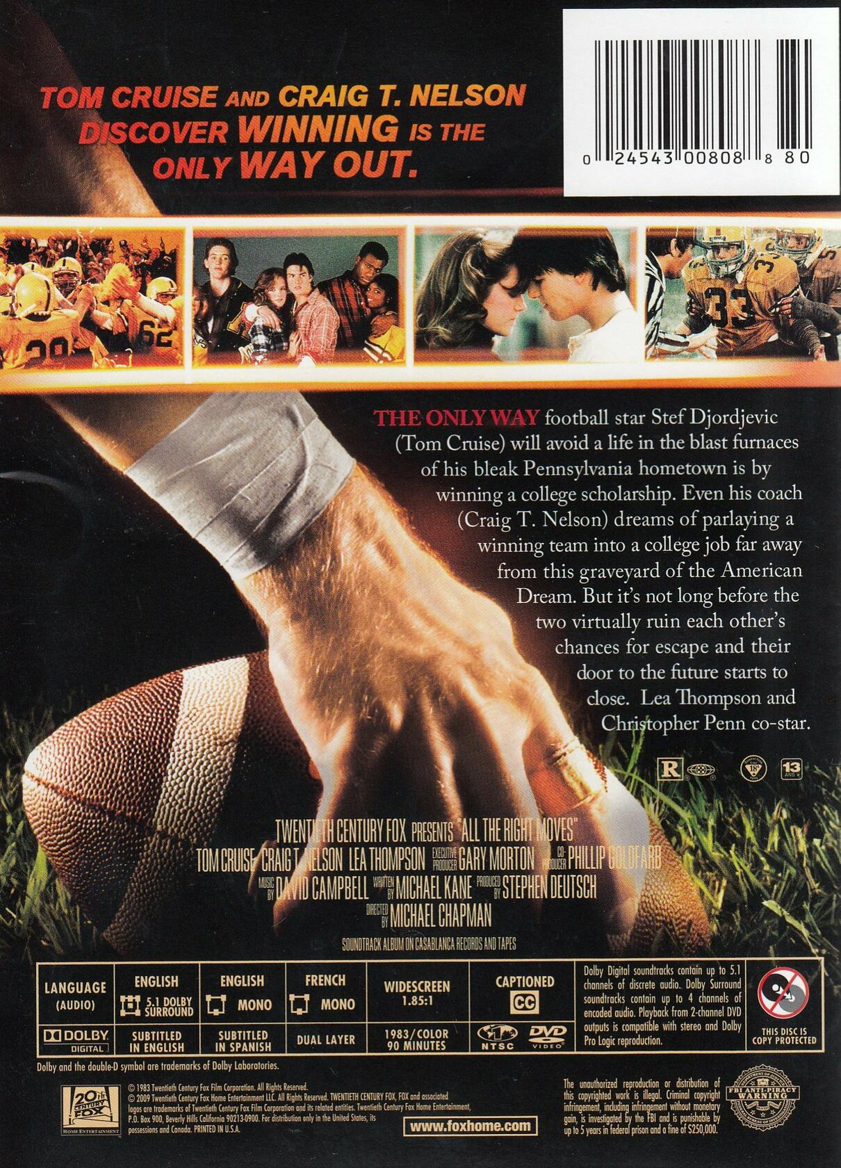 Amazon.caMost films about high school football players usually fall into one of two categories: glossy jock romance or locker-room sex farce. This one defies the odds and scores both as decent character study and decidedly unsentimental sports melodrama. It's not only a helluva coming-of-age yarn, but also, like Paul Newman's Slapshot, it's a bracing look at the hopes and dreams of blue-collar survivors. Tom Cruise plays a mill-town football star determined to escape the same traps that ensnared his parents. Craig T. Nelson, in a terrific villain role, is the coach who takes revenge when Cruise's ambitions drift a little too close to home. Michael Chapman, Martin Scorsese's favorite cinematographer, made his directorial debut with this gritty little winner, which benefits from being shot on location in Johnstown, Pennsylvania, and which is set to a great Jennifer Warnes-Chris Thompson theme song. Lea Thompson and Christopher Penn co-star. In 1983, another Cruise vehicle had even better moves: Risky Business. --Glenn LovellProduct descriptionAll The Right Moves ~ All The Right MovesFEATURES