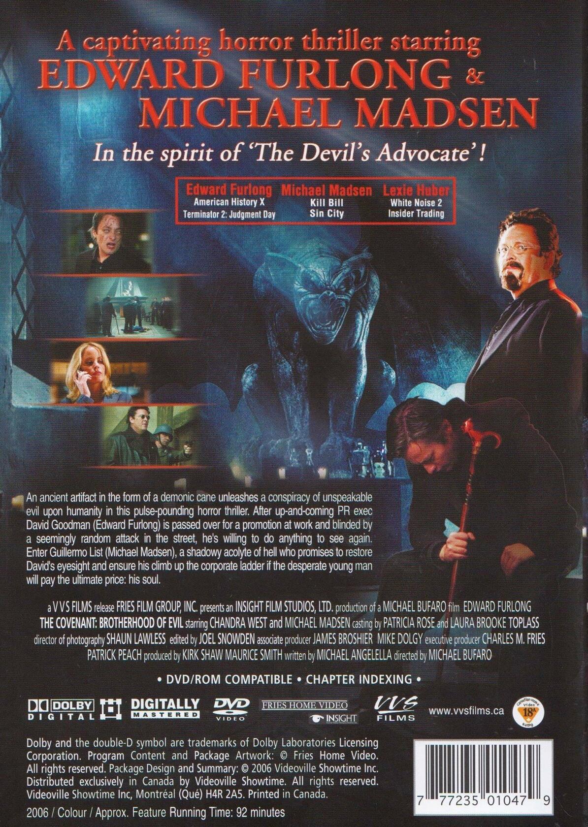 An ancient artifact in the form of a demonic cane unleashes a conspiracy of unspeakable evil upon humanity in this pulse-pounding horror thriller. After up-and-coming PR exec David Goodman (Edward Furlong) is passed over for a promotion at work and blinded by a seemingly random attack in the street, he's willing to do anything to see again. Enter Guillermo List (Michael Madsen), a shadowy acolyte of hell who promises to restore David's eyesight and ensure his climb up the corporate ladder if the desperate young man will pay the ultimate price: his soul.FEATURES