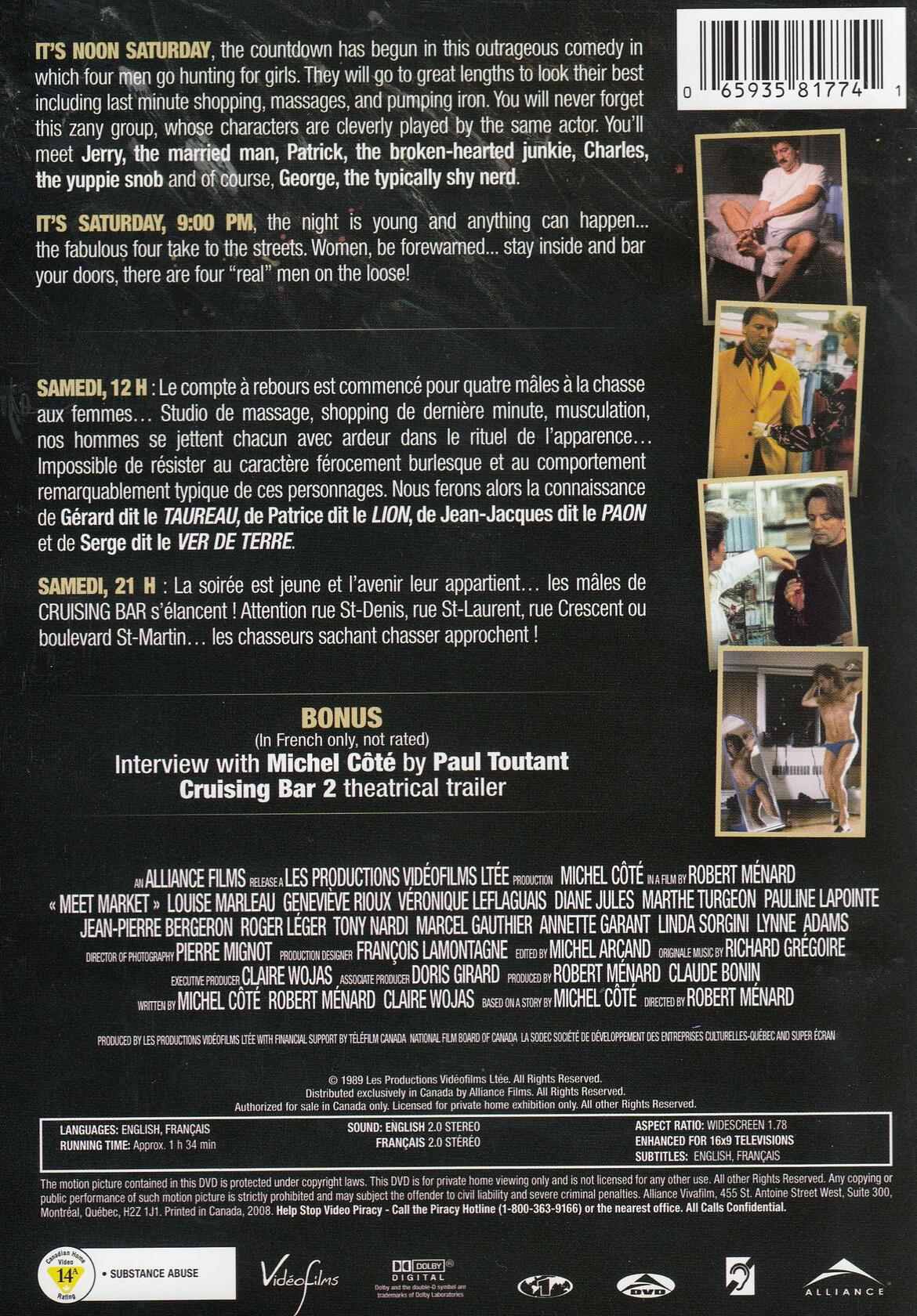 Amazon.caPrécurseur, au Québec, dun genre qui rapporte encore gros (la comédie poids lourd), Cruising Bar ne fait pas dans la dentelle mais démontre, quatre fois plutôt quune, que Michel Côté est un acteur qui a de labattage.Le tandem que composent la scénariste Claire Wojas et le réalisateur Robert Ménard a abordé tous les genres, de Tes belle, Jeanne à LEnfant deau. Ici, le duo vise la qualité dAffreux, sales et méchants, mais atteint plutôt le niveau dElvis Gratton dans ces histoires parallèles de quatre stéréotypes de séducteurs. Cest Michel Côté qui les incarne tous : Jean-Jacques, le paon, séducteur narcissique ; Gérard, le taureau, gros pas compliqué ; Patrice, le lion, maniaco-dépressif carburant à la cocaïne ; et Serge, le ver de terre, laideron ridiculisé par tous et toutes.Cruising Bar, cest de la comédie de situations dans toute sa splendeur… ou toute son horreur, selon le point de vue où lon se place. Plutôt quune étude de caractères cinglante, Robert Ménard nous sert ici une galerie de caricatures, une suite de sketches inégaux où sagitent des personnages sans substance. On ne peut toutefois que saluer le tour de force de Michel Côté, stupéfiant dans chacun des quatre rôles. Dommage que le scénario ne soit pas à sa hauteur… --Éric FourlantyFEATURES