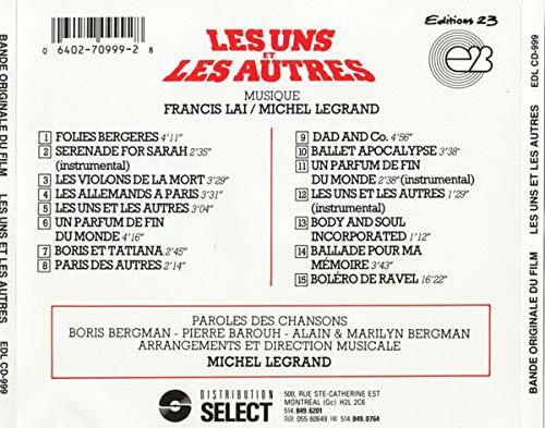 1 Folies Bergres Vocals Catherine Russell , Ginette Garcin 4:11 2 Serenade For Sarah (Instrumental) 2:35 3 Les Violons De La Mort 3:29 4 Les Allemands A Paris 3:31 5 Les Uns Et Les Autres Arranged By [Rhythmique] Christian Gaubert Orchestrated By Michel Legrand Vocals Nicole Croisille Written-By Pierre Barouh 3:04 6 Un Parfum De Fin Du Monde Vocals Michel Legrand 4:16 7 Boris Et Tatiana 2:45 8 Paris Des Autres Vocals Liliane Davis 2:14 9 Dad And Co. Vocals Jackie Ward 4:56 10 Ballet Apocalyse 3:38 11 Un Parfum De Fin Du Monde (Instrumental) 2:38 12 Les Uns Et Les Autres (Instrumental) 1:29 13 Body And Soul Incorporated Voice Francis Huster, Manuel Gelin 1:12 14 Ballade Pour Ma Mmoire 3:43 15 Bolro De Ravel Composed By Ravel Vocals Christiane Legrand, Jean-Pierre Savelli 16:22FEATURES